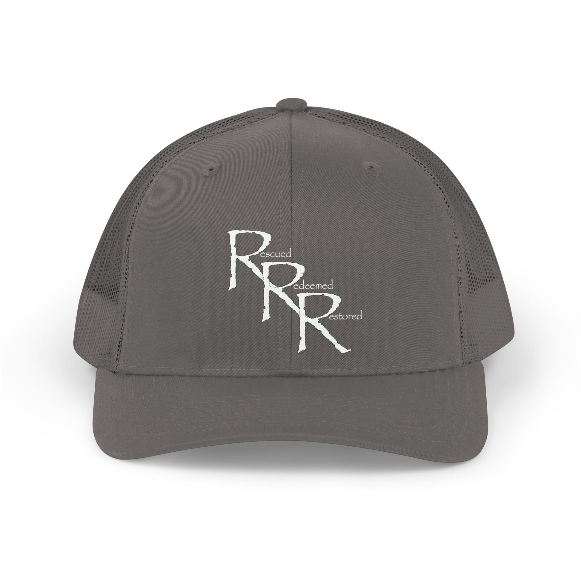 A retro trucker hat with a lived-in vibe, structured front panels, breathable mesh back, and a gently curved Permacurv® visor that keeps the sun off without feeling stiff. The front shows the simple RRR logo (Rescued | Redeemed | Restored) in contrasting white, giving the hat a rugged look. Wear it on gravel roads, early-morning drives, or when you want a low-key piece that still reads intentional. The mid-profile crown sits comfortably above the brow, while the snapback lets you tune the fit in seconds. Lightweight yet sturdy, this hat settles into your rotation and becomes the one you reach for when you want to look put-together without trying too hard.