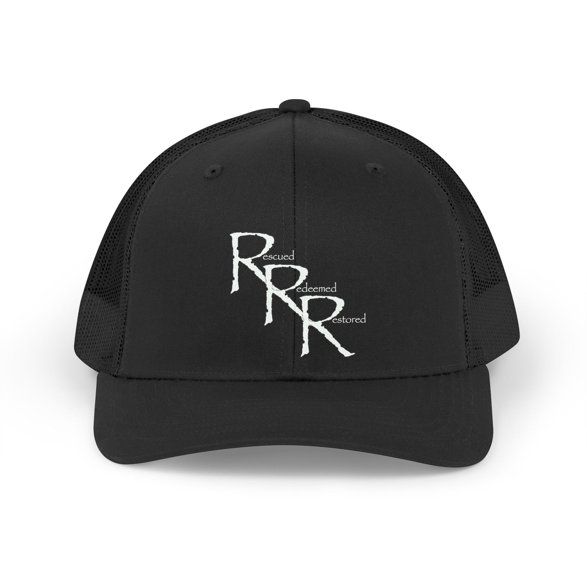 A retro trucker hat with a lived-in vibe, structured front panels, breathable mesh back, and a gently curved Permacurv® visor that keeps the sun off without feeling stiff. The front shows the simple RRR logo (Rescued | Redeemed | Restored) in contrasting white, giving the hat a rugged look. Wear it on gravel roads, early-morning drives, or when you want a low-key piece that still reads intentional. The mid-profile crown sits comfortably above the brow, while the snapback lets you tune the fit in seconds. Lightweight yet sturdy, this hat settles into your rotation and becomes the one you reach for when you want to look put-together without trying too hard.